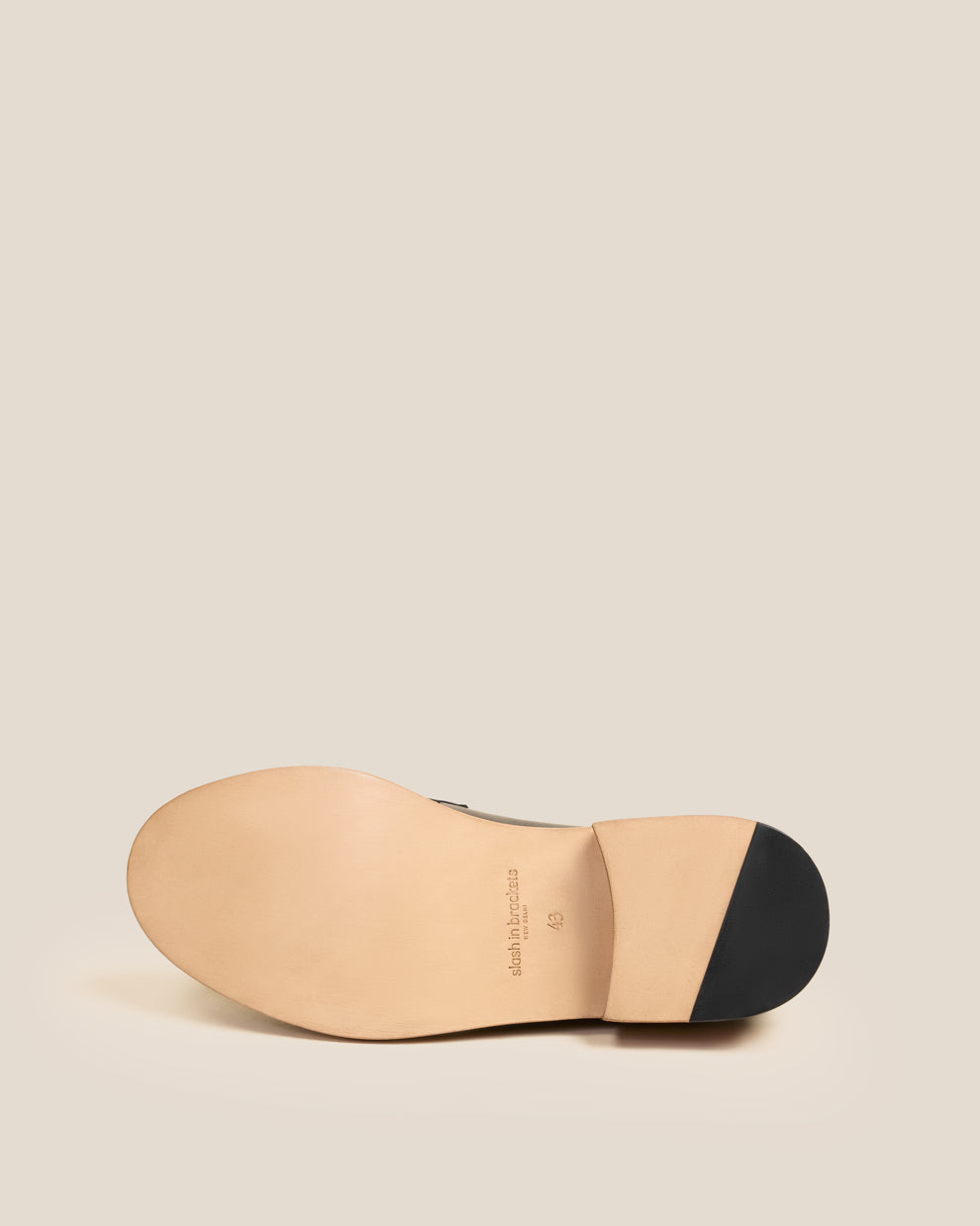 Each pair is entirely handmade in New Delhi by master artisans. Slash in Brackets proudly supports responsible leather tanning through the Leather Working Group.
