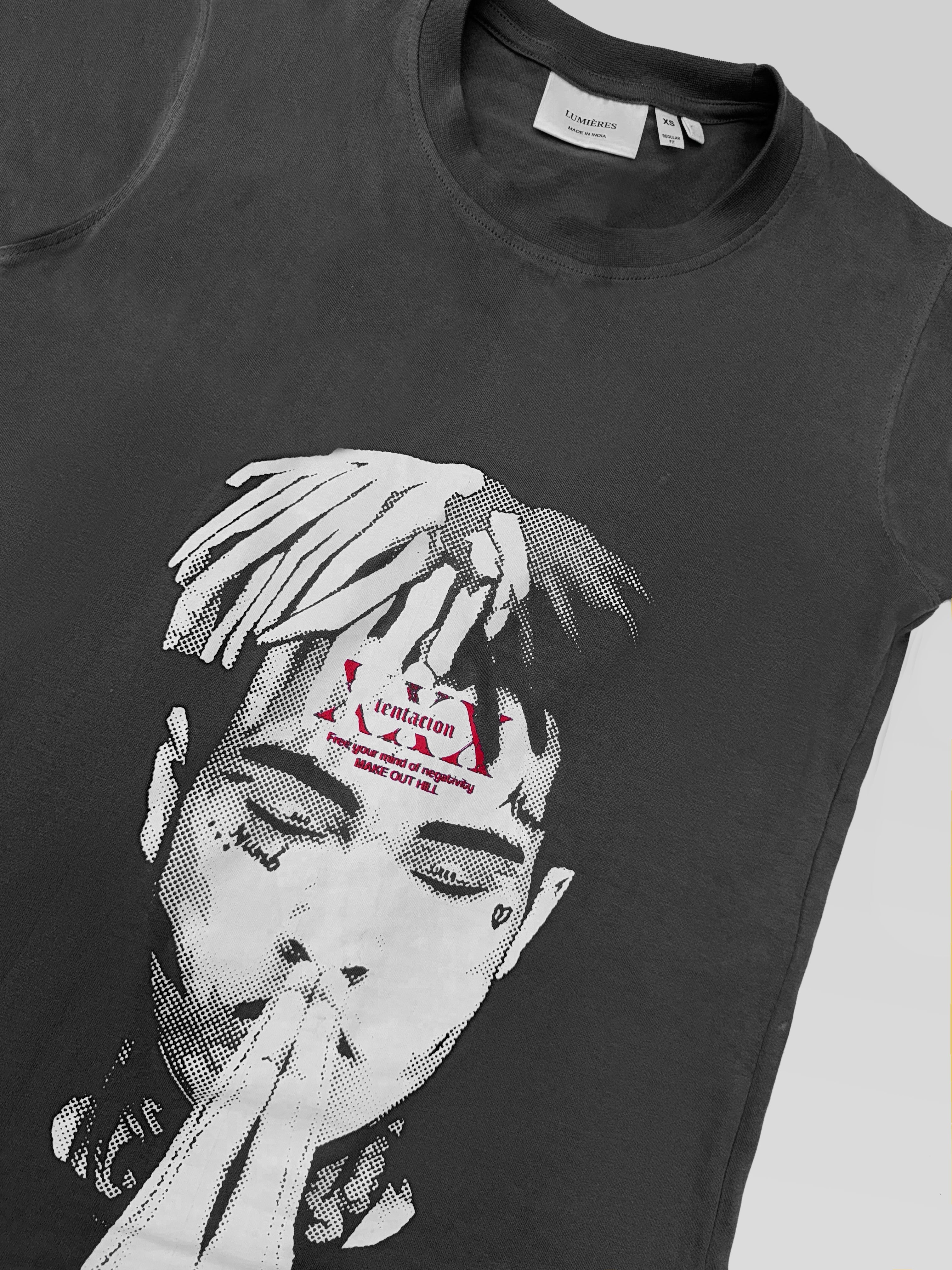 Unisex Regular Fit T-Shirt with crewneck and fitted sleeves available in 2 colorways : Charcoal and White. The design is a tribute to the legendary artist, XXX Tentacion and his impact on people's lives and the hip-hop culture through Music.