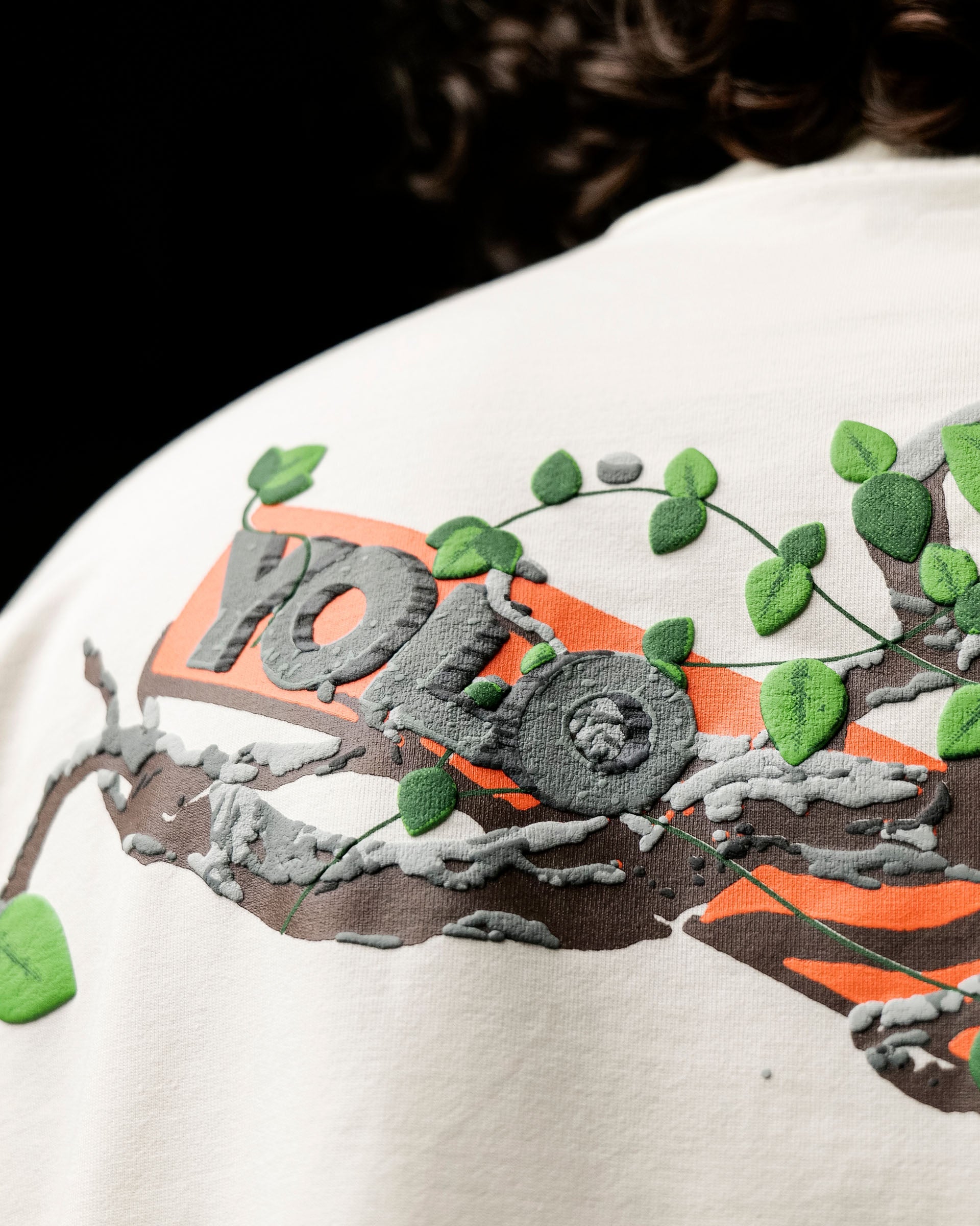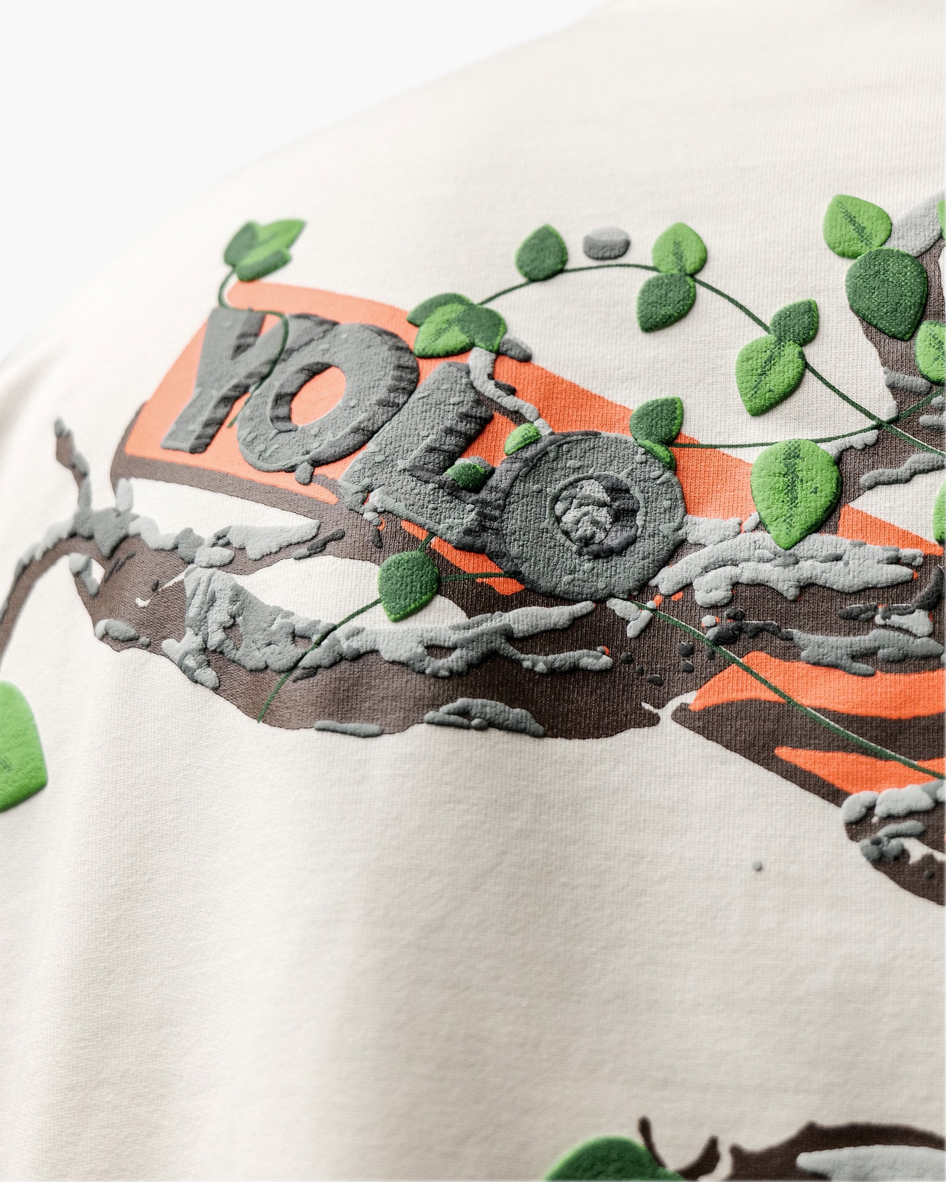 Premium oversized unisex T-shirt crafted from Cotton Spandex Terry Looper. Featuring a vibrant 3D puff print of “YOLO” entangled in a blooming tree branch, this oversized graphic t-shirt blends nature and streetwear. Crafted for comfort and designed to stand out — perfect for urban fashion lovers and nature-inspired outfits.