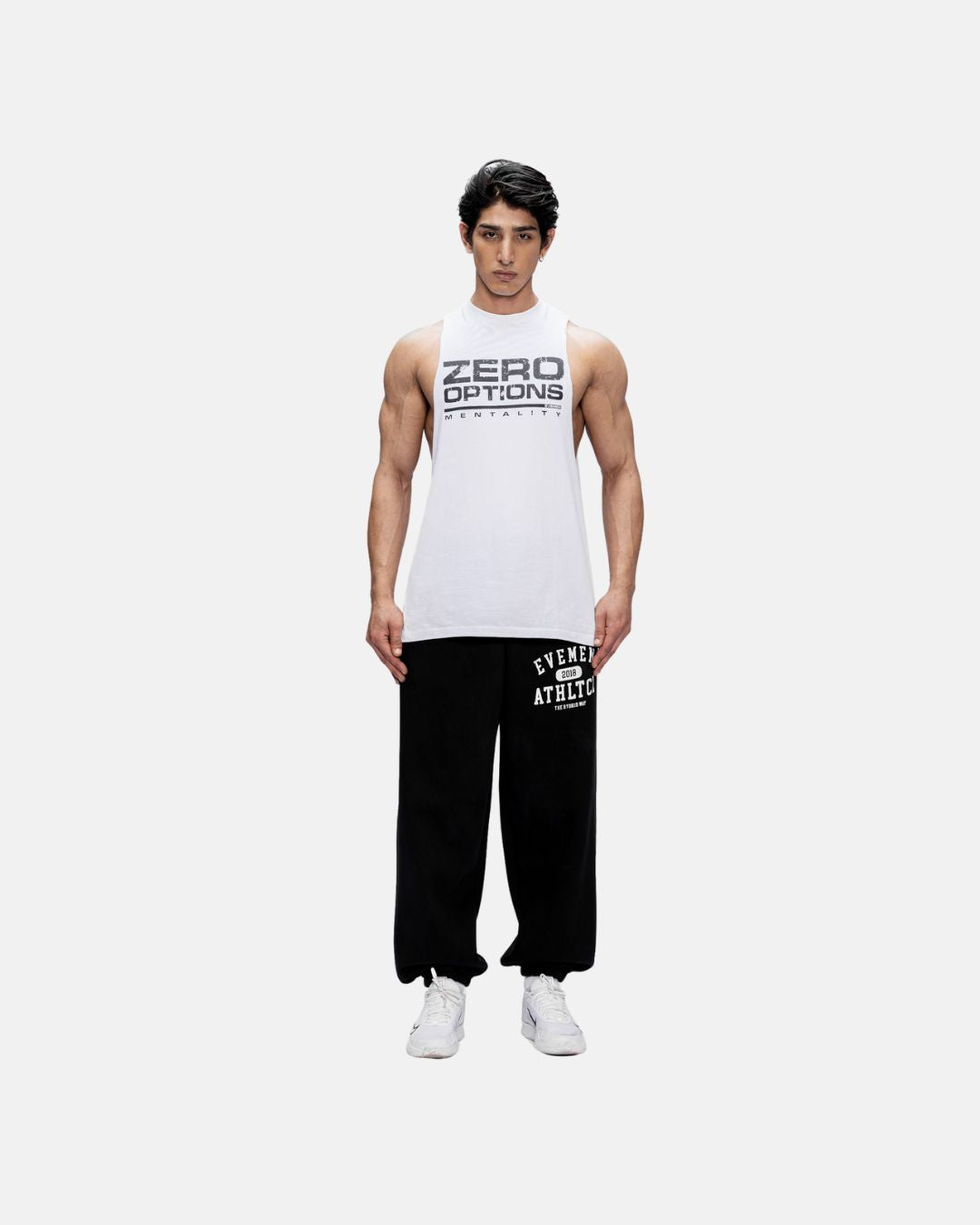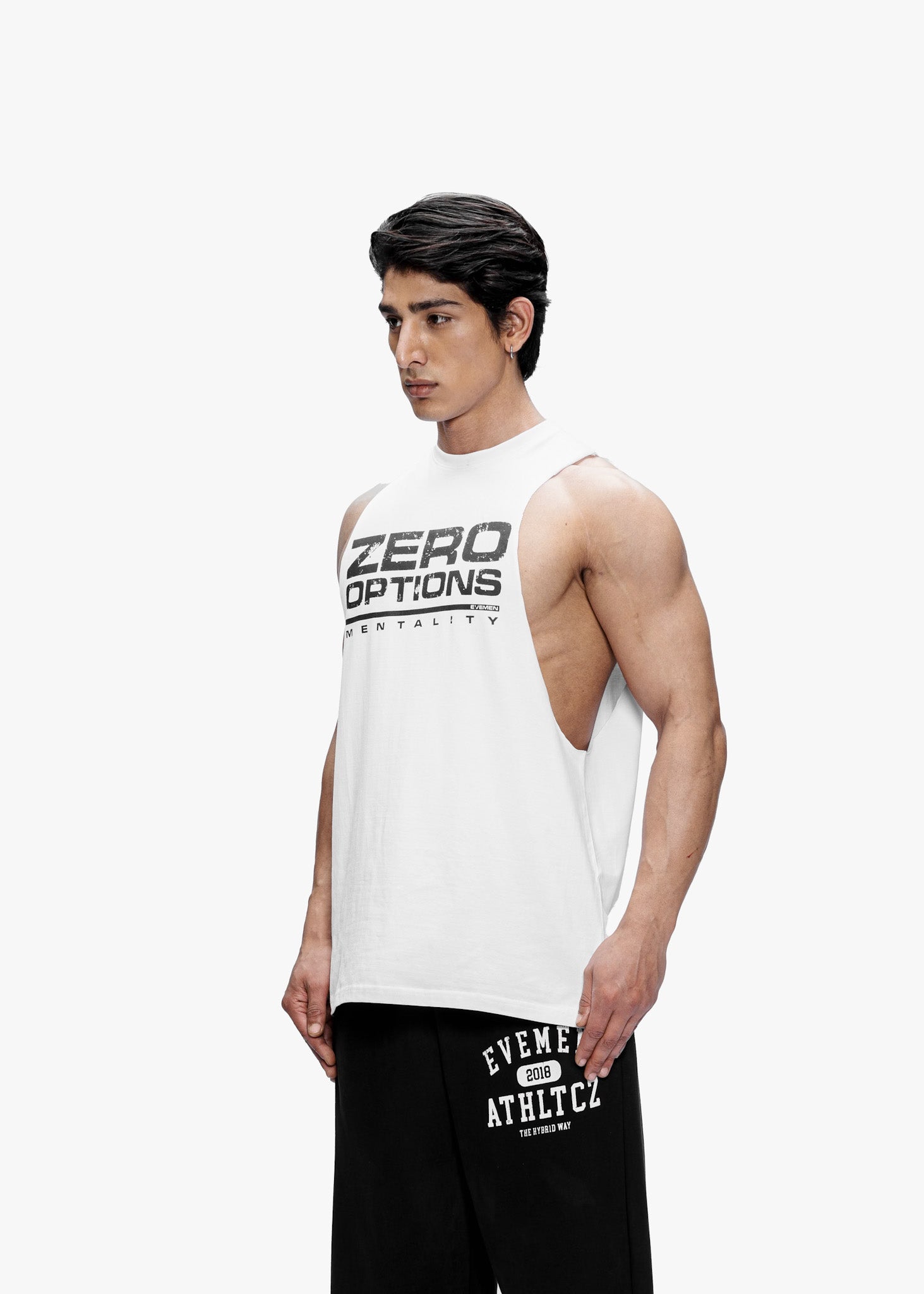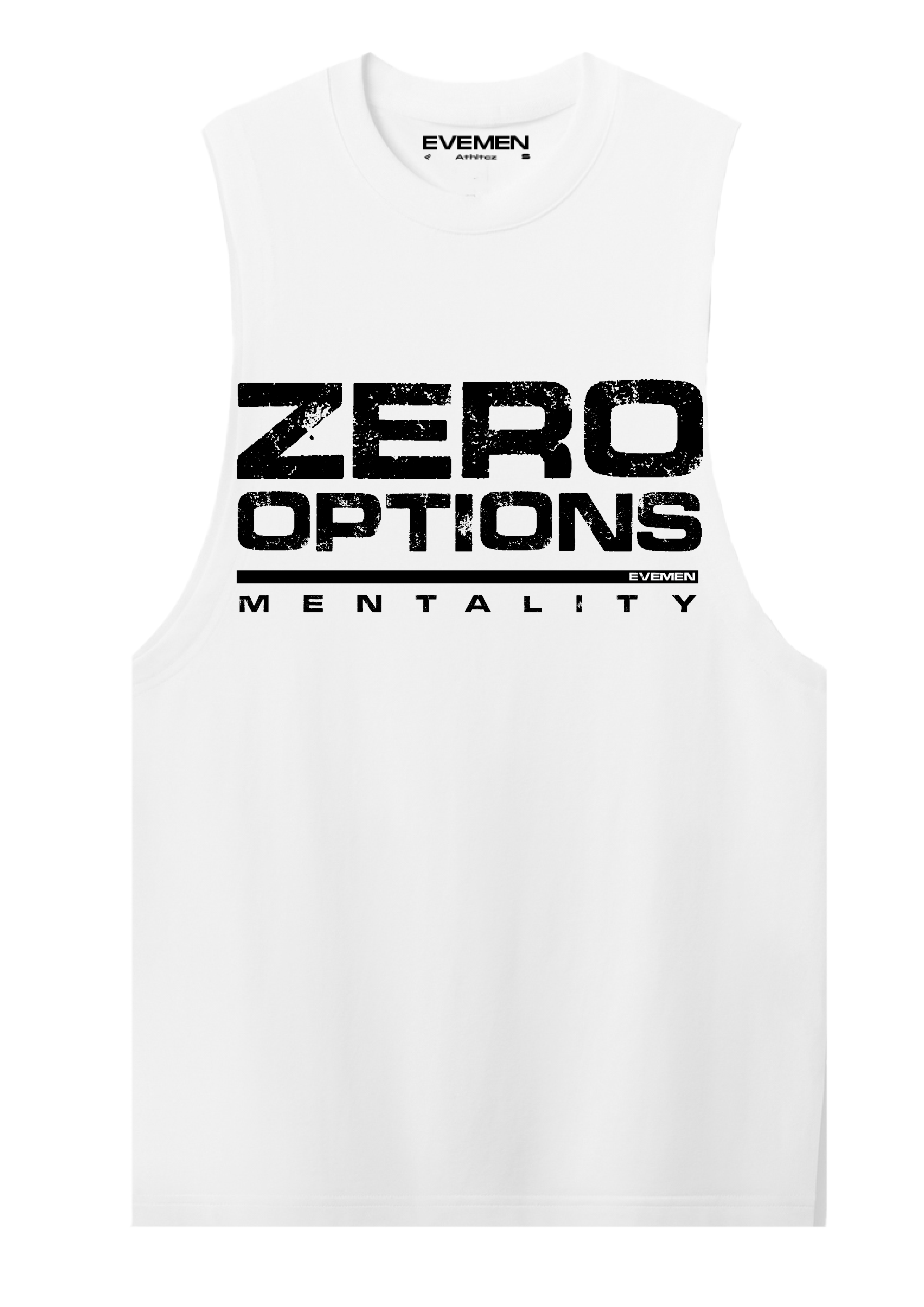 Introducing the Zero Opt. Cut-Off Hoodie, expertly crafted from 100% cotton for a soft, relaxed fit. This sleeveless design features the Zero Opt. Mentality prominently screen printed on the front, complemented by a logo on the back. Whether you're working out or relaxing, this hoodie combines style and comfort.
